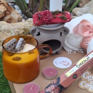 El aroma a chocolate belga transforma cualquier rincón en un espacio íntimo y reconfortante, evocando sensaciones de hogar, calma y placer. La vela en taza aporta un toque decorativo y sofisticado, mientras que los waxmelts permiten intensificar la experiencia aromática con el quemador incluido.